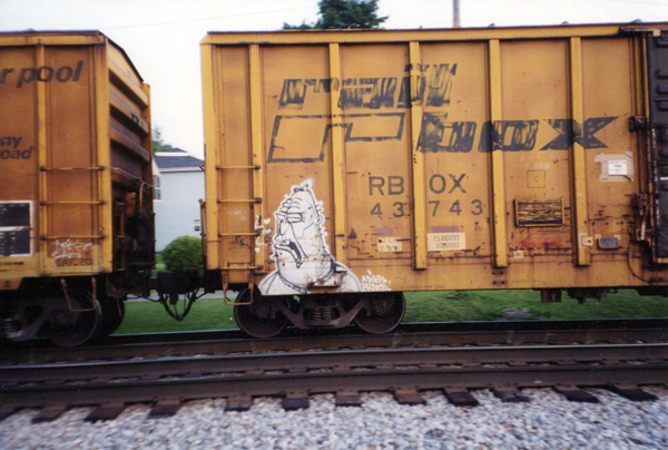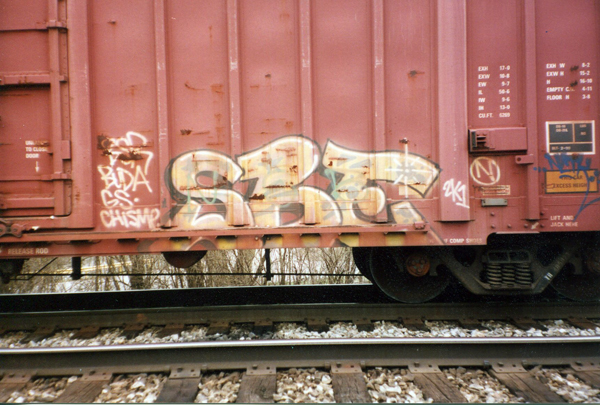 Richmond’s railroad history goes way back! Today we still see a fair amount of rail traffic. Norfolk Southern’s single track runs through Richmond from Cincinnati, Ohio to Ft. Wayne, Indiana, in what they call the New Castle District. Watching trains is called “benching” by graffiti writers. Benching freights was my first exposure to graffiti from outside the area, and even still today you can see graffiti from all over the country, Canada, and even Mexico roll by. From time-to-time I will be posting classic photos of freight train graffiti passing through Richmond, IN.