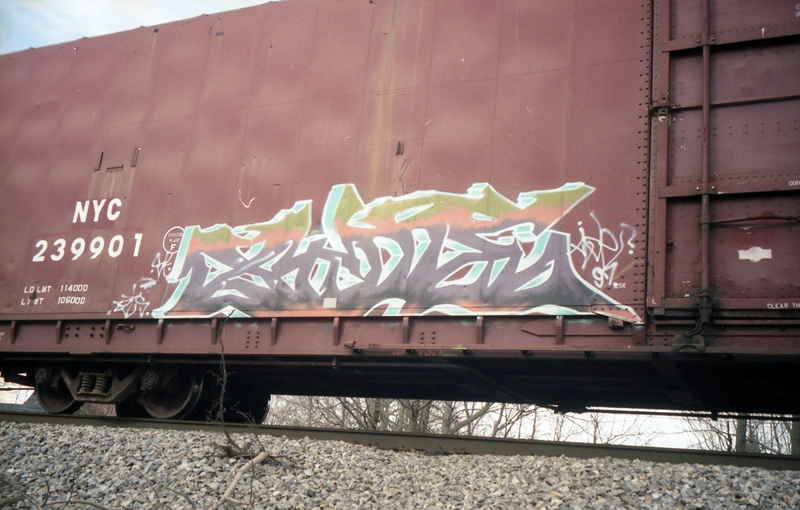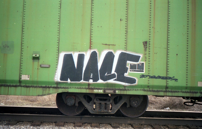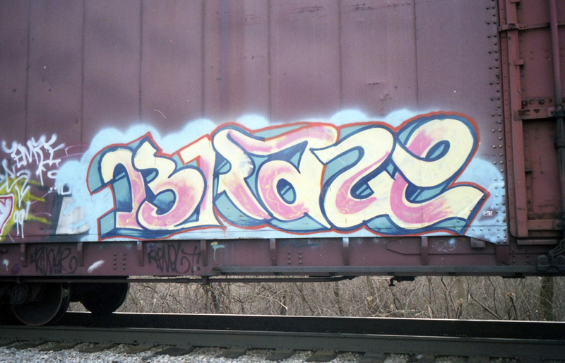 In 2000 or 2001, I was out skateboarding with a friend. We drove near the railroad tracks, and saw a train was going by really slowly. So, we stopped and got out and I ran up closer and started taking pictures of it. A throw-up on a hopper by an online and real-life pen-pal of mine came up. It was exciting to see a freight by someone I knew from a different state. The train stopped. I looked down the tracks, and said, “Holy sh*t!”, One of the train cars was dangling off the tracks like a toy train. I told my friend what had happened and we drove further down, and parked the car. We walked the line and took photos, although he forgot his camera and was bummed. Up ahead we could see someone walking towards us. It was a railroad worker, he has an older black guy wearing an old school conductor hat. He told us that if we needed to cross over the line, we should do it here, because the auto-carrier cars didn’t have platforms on them, and that the train was going to be there for a long time. We did what he said and walked back. Later on, a crane removed the derailed hopper and set it on its side next to the tracks, where it sat for a long time. These are some of the pictures I took that day. This is one of the few Braze pieces I’ve ever caught.