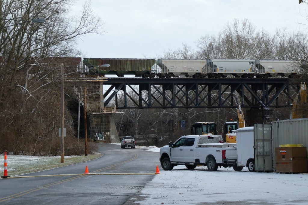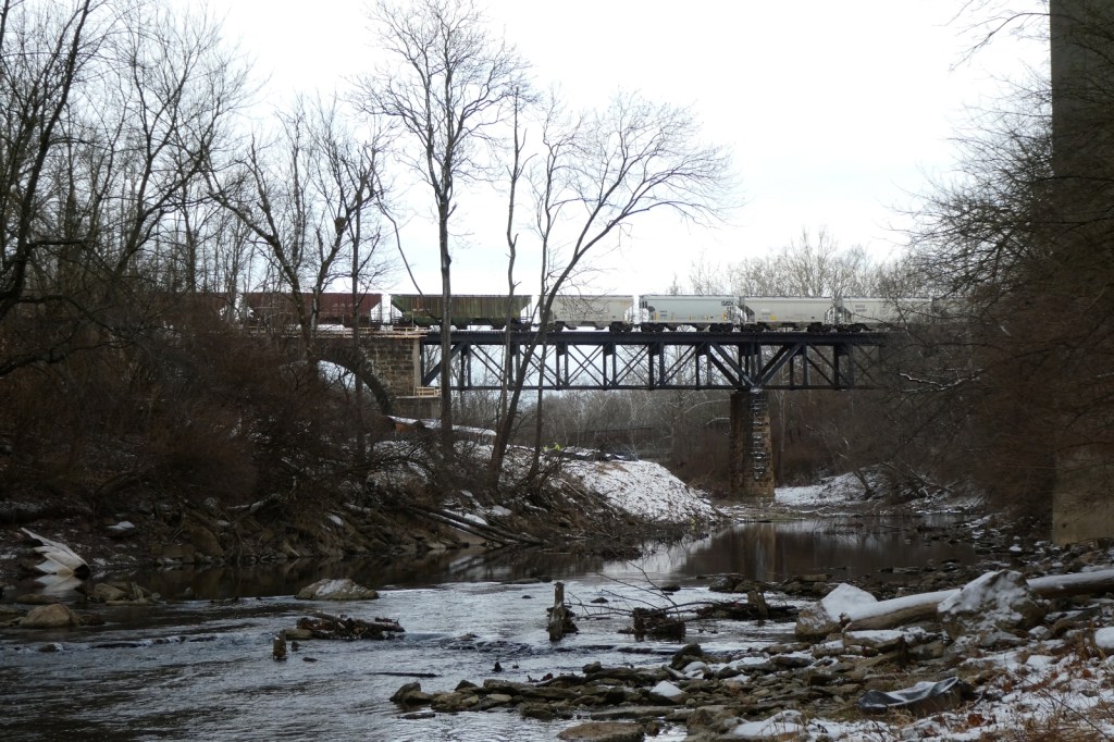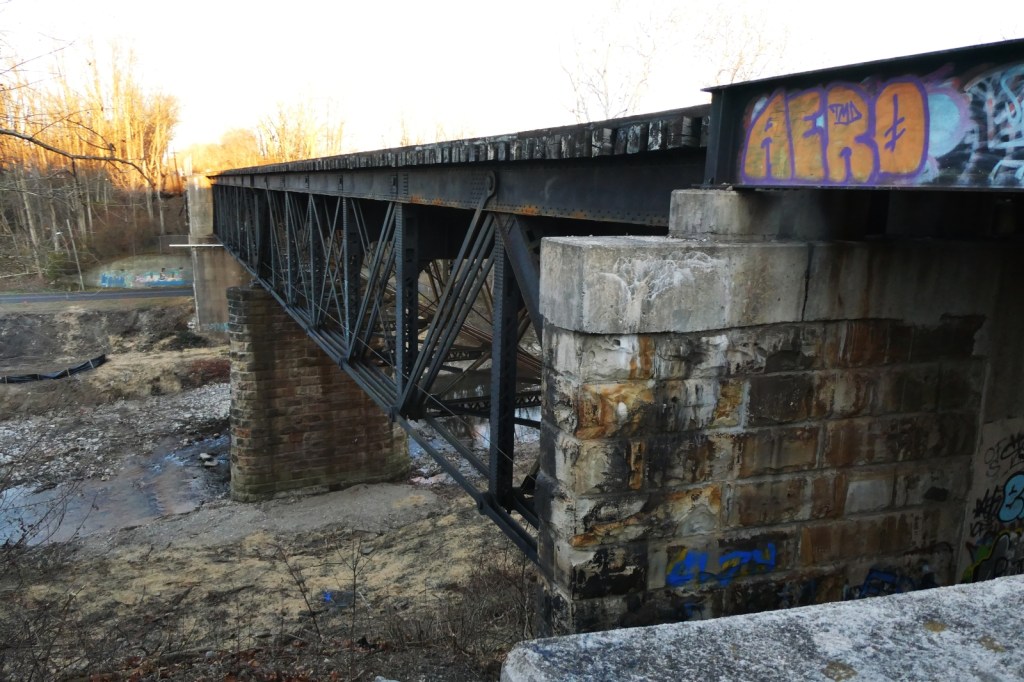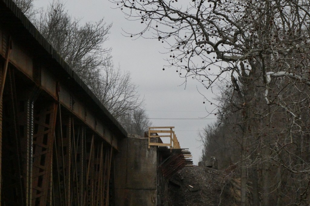 Norfolk Southern is replacing the historic Whitewater River Pennsylvania Railroad Bridge that spans over the Whitewater Valley Gorge. According to the board minutes of the Richmond Board of Works meeting from Sept. 18, the replacement project by Hall Contracting of Kentucky, Inc, began in Nov. 2025 and will take about one year to complete. This bridge has been a fixture in the community for those who work, travel through, or explore the Whitewater Valley Gorge, and in recent decades, those walking or bike riding the Cardinal Greenway, on the former C&O line that travels directly beneath the former PRR bridge. The massive steel bridge has been included in hundred of photos I have take in the last 25 years. The original bridge was built about 1870, and the current trusses were built in 1902 on the original stone abutments (Source: https://www.bridgehunter.com/bridges/45986). It was originally a bridge of the Pittsburgh, Cincinnati, Chicago and St. Louis Railroad. I will be posting updates on this as demolition progresses, as well posting older photos I have taken or acquired. (Image 1: bridgehunter.com)
