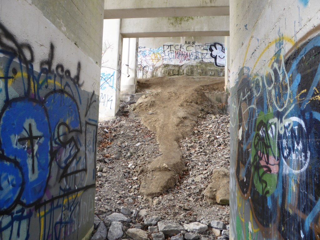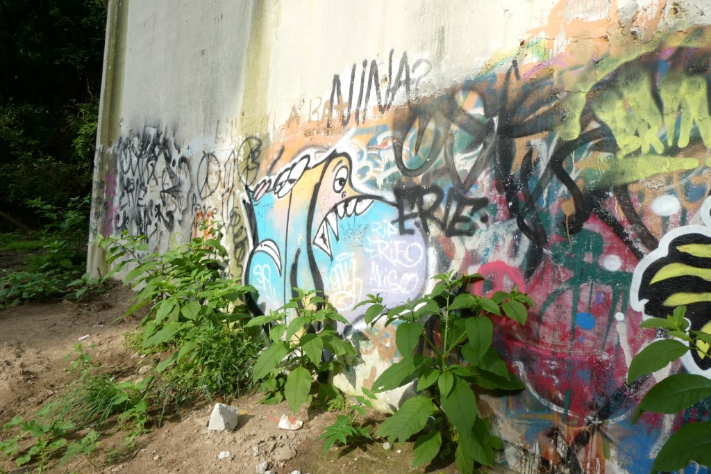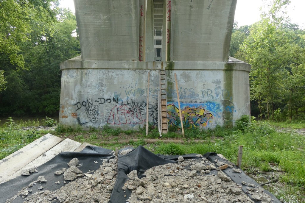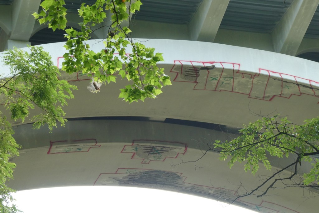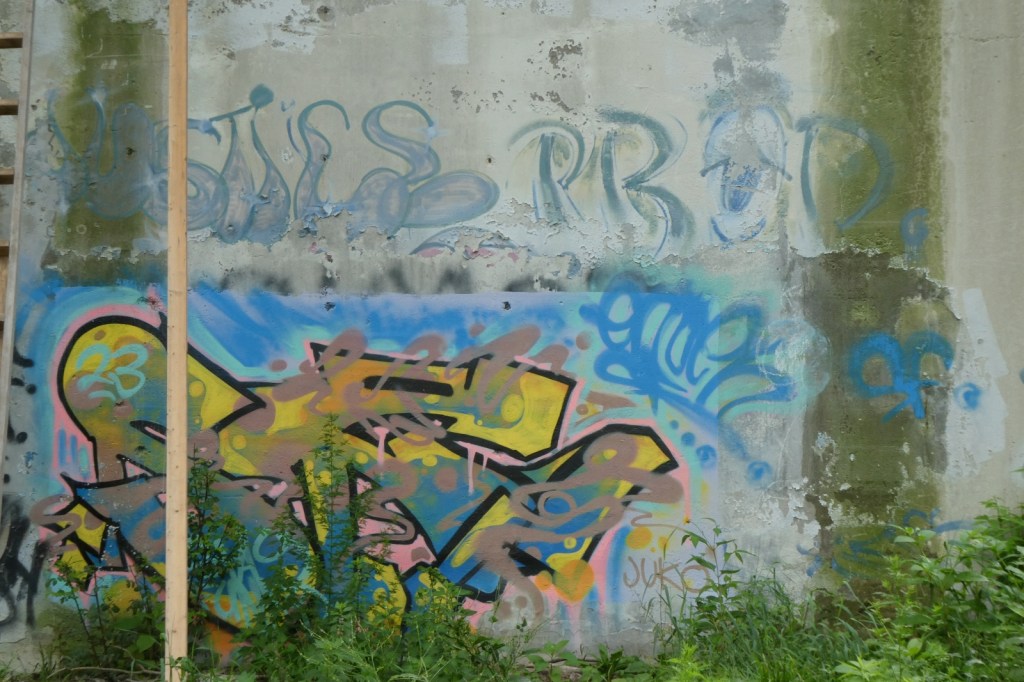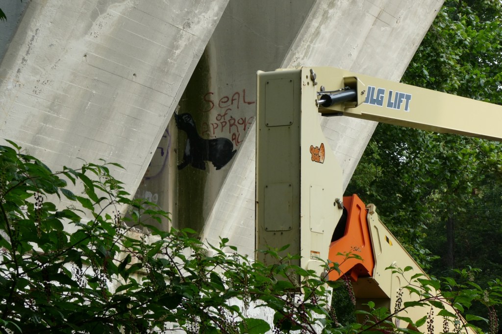 The “G” Street Bridge, originally known as the South Side Bridge was completed in 1932 and it was updated and modified in 1990. In 2024, the G-Street bridge was closed for an extended period of time to repair and resurface the deck, arches, sidewalk, and street. Much of the trees and brush underneath it were cleared, opening up ancient graff barely holding on underneath it all, as well as newer pieces and throw-ups. The repair work appears to be done, but I imagine the bridge will be repainted at some point. The epic “Dark Justus” production from the late 90s (Final Image) is still clinging to the surface as the sun and weather now rapidly deteriorates it (Images 9-13). The “Seal of Approval” still hangs on tucked away (Image 8).