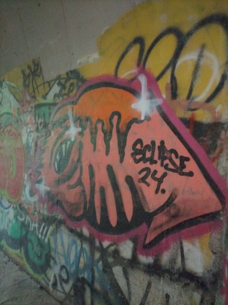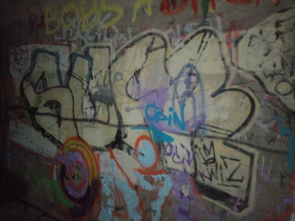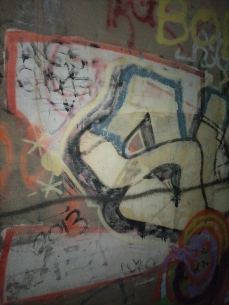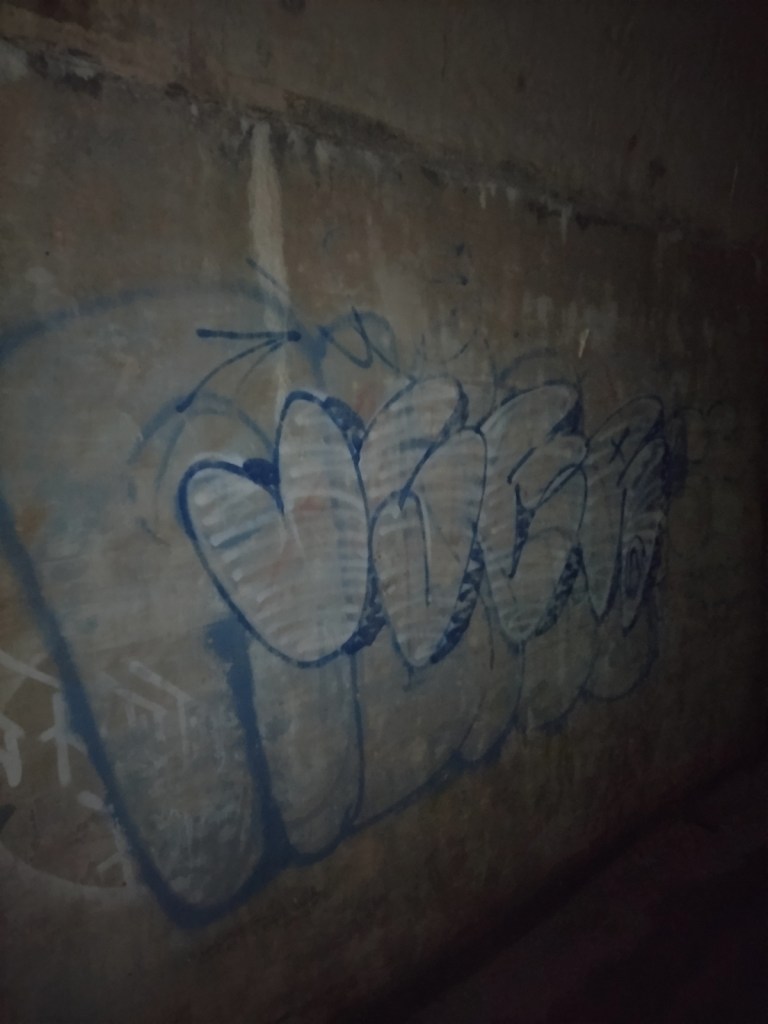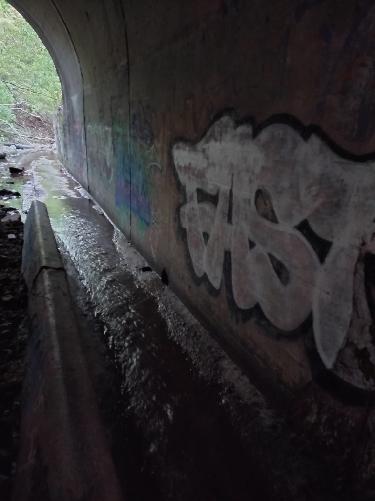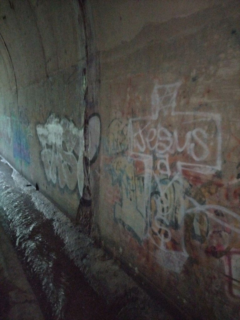 Here are some low-quality smart phone pictures from Sept. 2024 using the flashlight option to document one of the dark tunnel spots. The photos aren’t great, and a lot of the stuff is dissed, but at least you can see what you’re looking at it. The SUFR fill-in is from 2013 and is over a SUFR roller from 2000. The Kwiz, “Skills Flow Like Ink” piece (under “Jesus Saves”) was still visible at the time of the photos, but shortly after it was completely covered, unfortunately. I’ll be making a separate post about that one. Also visible is Erie, Rest in Piece.