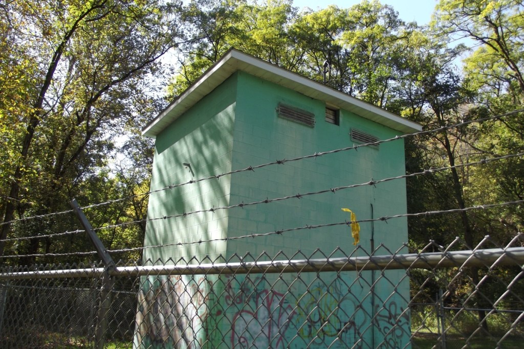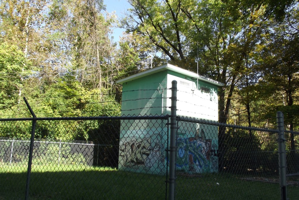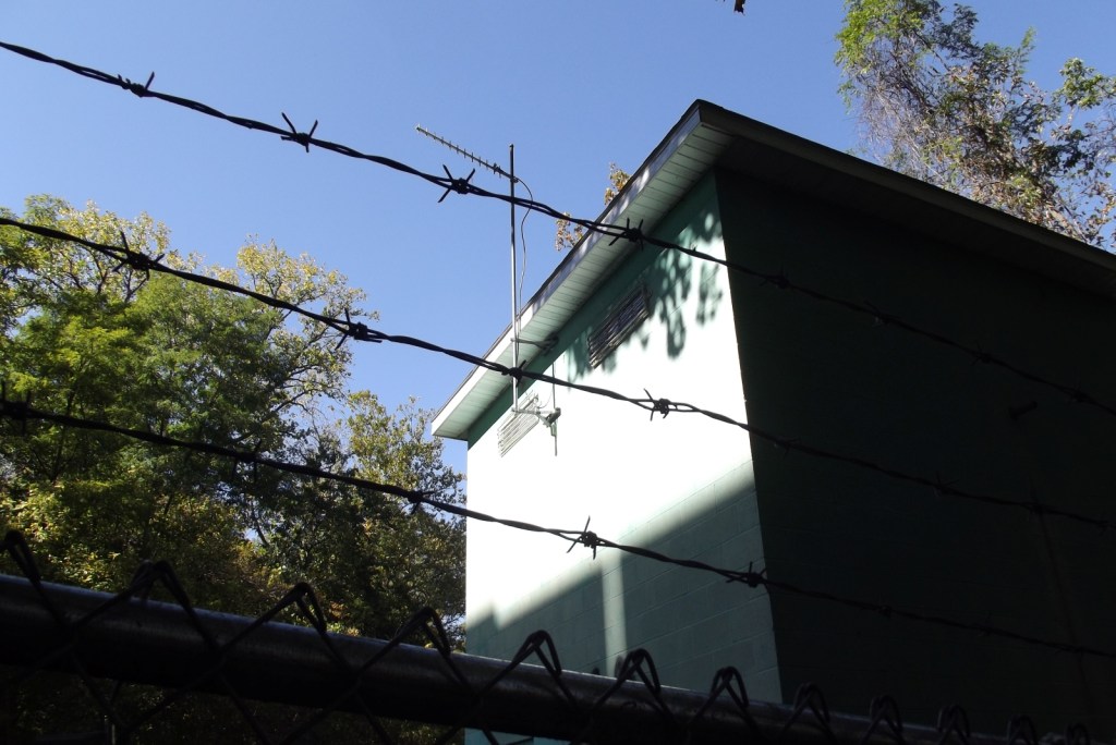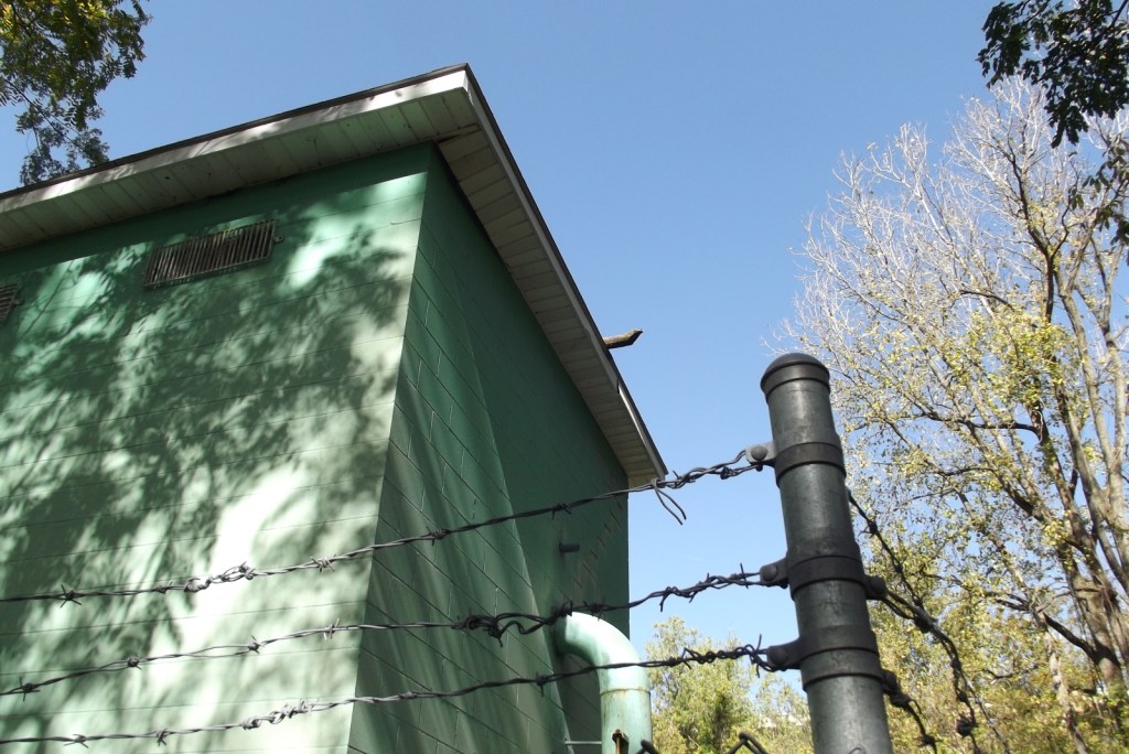 Some B-side photos of these green cinder-block buildings. Digital photos from early Oct. 2013. These mostly got painted before the addition of the barbwire fences.