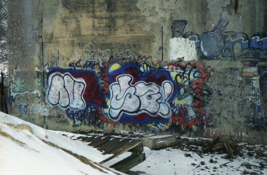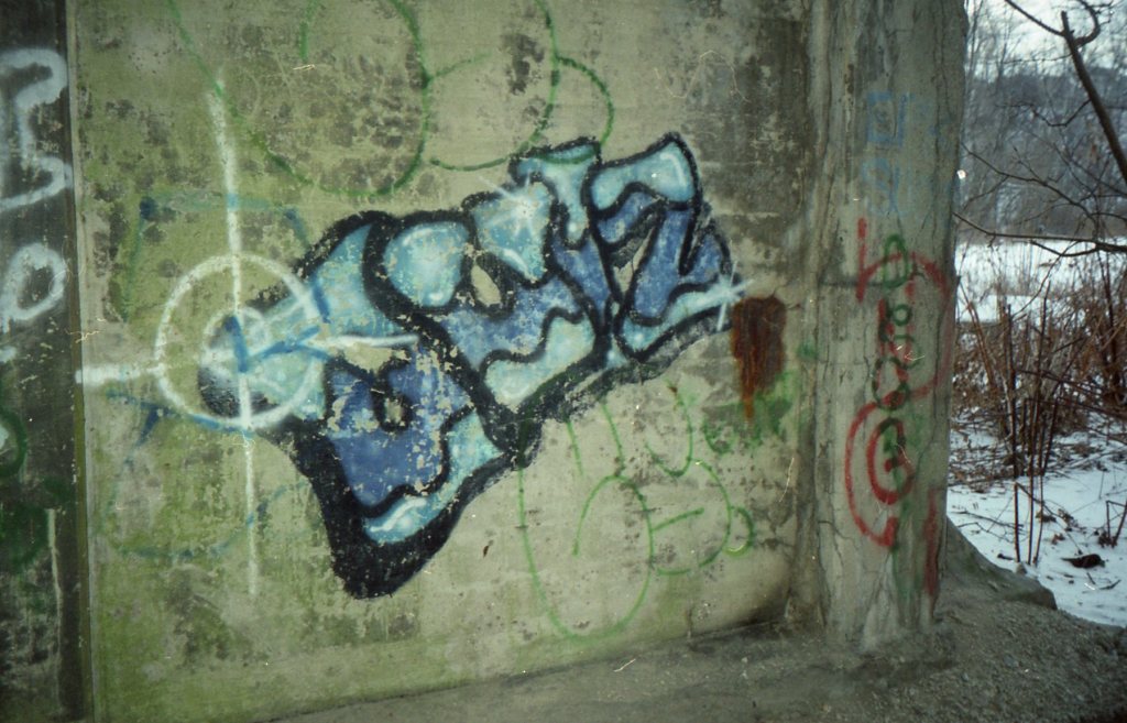 Here is a scanned image from the Library of Congress, public domain, of the Main Street Bridge during construction, circa 1920, and some scans of my negatives from the end of winter 2000. I have posted these other two photos earlier, but I incorrectly thought they were from 2002. The first one is Nuro Senoz throw-ups over their old names Moe and Sir, over a nice Mize piece. There is a Bong Squad production to the right (the “O” appears to be a bong) with a lighthouse depicted. The second photo is a nice, angled, 4 color with a blue fill, “Quiz” Kwiz piece, with the ever-present “ES” green outlines over everything. I recall my very first attempt at a piece, maybe in 1997/98, was underneath this bridge and when I came back later to explore, it was also dissed by Es., which means the artist was active at the time.